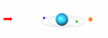 蓝色粒子→高能级轨道上运动,绿色粒子→低能级轨道上运动,红色色箭头→光照通过时,