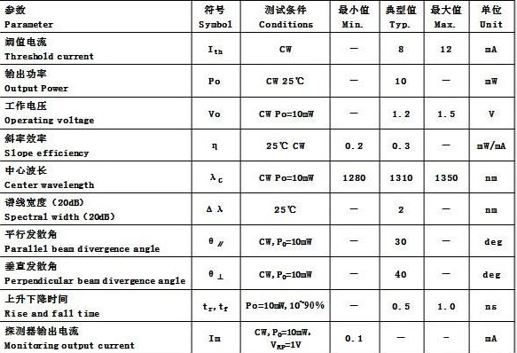 FP激光器典型参数表
