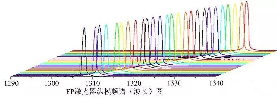 FP激光器,当注入电流在阈值电流Ith附近时,可以观察到多个纵模;进一步加大电流,谱峰处的某个波长首先激射,消耗了大部分载流子,压制其它模式的激射,有可能形成单纵模工作;当对FP激光器进行高速调制时,原有的激射模式就会发生变化,出现多模工作;