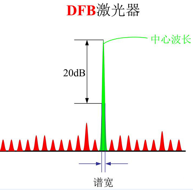 DFB激光器,高速调制时也能保持单模特性,可用于远距离传输。尽管DFB激光器在高速调制时存在啁啾(谱线展宽),但比FP激光器的动态谱线的展宽要改善一个数量级左右。