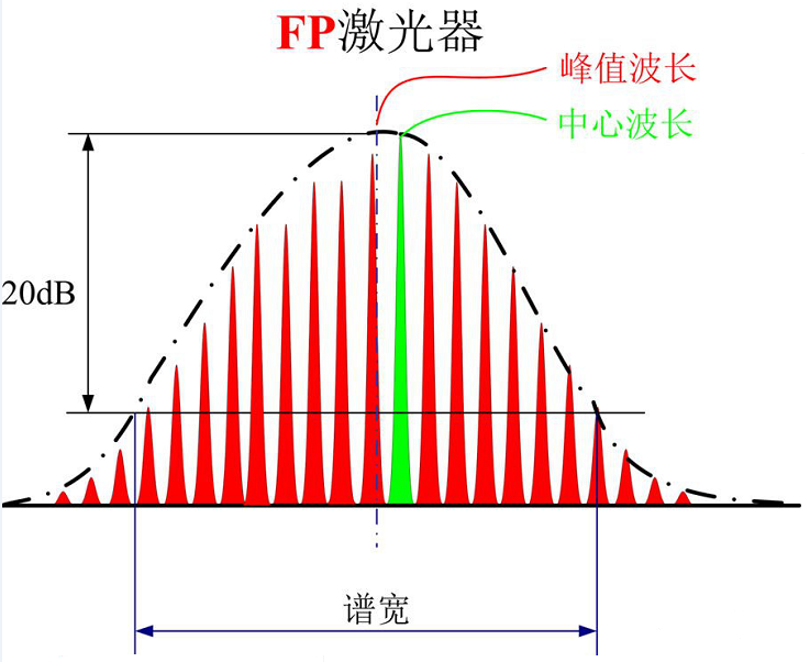 FP激光器,峰值波长下降20dB处的全谱线宽度(各纵模加权平均值):