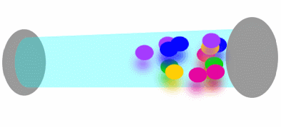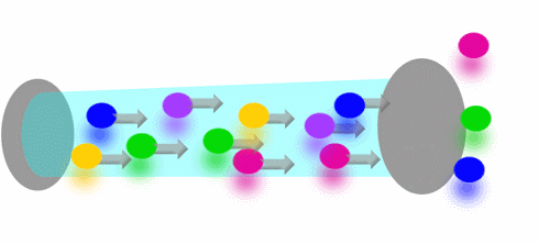 光子在谐振腔中来回振荡,放大(不同颜色的小球代表不同频率,即不同波长的光子);