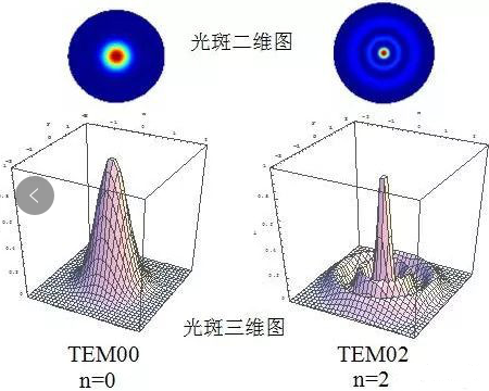 横模指数n代表光斑的“光环”数量,n=0时光斑为集中的一点,没有光环;n=2时则有两圈“光环”;