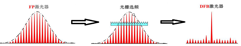 光栅的作用是衍射,按照傅立叶理论,衍射过程其实就是选频;即,DFB的原理:光栅选频实现单模工作: