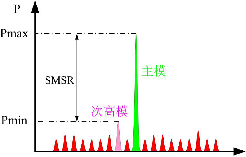 此图为DFB激光器纵模频谱图,不同频率(波长)对应的光强不同,Pmax(Power最大)的纵模称为主模,其余纵模称为边模,Pmin(Power最大)的纵模为最大边模;相比FP激光器,DFB激光器多了一个衡量光栅提高主模、抑制边模能力的指标: